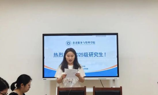 接着,2025级研究生新生代表李然同学发言。她分享了自己选择养老管理专业的初心源于对现实需求的观察——智慧养老设备与长者使用习惯的脱节、长期照护体系区域发展不均衡等现实问题。她表示,老龄化社会不仅需要“会做”的执行者,更需要“能想”的研究者,呼吁同学们充分利用公司中医药+养老的特色优势,在守护夕阳红的道路上肩负起时代使命。