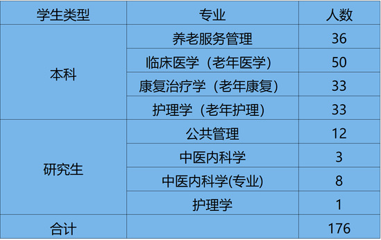 培养目标:培养具有扎实的基础医学、临床医学基本理论、基本知识和基本技能,一定的公共卫生和预防医学知识、扎实的老年医疗卫生保健知识和技能、一定的自然科学和人文社会科学知识,具备良好的医学职业素养、终身学习能力和创新意识及能力,能在综合性医院、老年专科医院、康养机构和医学科研院所等单位从事医疗、教学、研究工作的复合型人才。