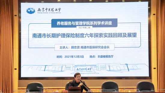12月3日,williamhill英国官网邀请南通市医疗保障研究会会长顾忠贤在仙林校区丰盛楼报告厅作题为“南通市长期护理保险制度六年探索实践回顾及展望”的学术讲座。公司党总支副书记、副经理刘云龙、相关专业教师、2021级本科生、研究生及其他公司部分师生参加讲座。讲座由刘云龙副书记主持。