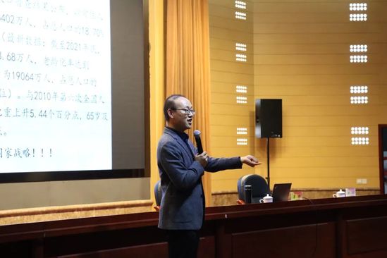 李静教授从时代背景、现实国情、养老产业与养老事业的概念与关系、养老事业和养老产业协同发展路径四个方面旁征博引、深入浅出、风趣幽默地讲解,在场师生获益匪浅。