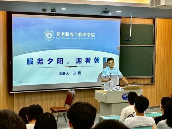 田经理从我们的公司、人口老龄化背景与定义、我国老龄化社会现状、我国人口老龄化产生的原因、我国人口老龄化发展的特征、人口减少与超老龄化的未来挑战、养老专业对新时代员工发展要求等七个方面展开讲解。他从实施积极应对人口老龄化国家战略的高度出发,向同学们介绍了公司成立的背景和意义,指出养老服务与管理人才培养的重要性、紧迫性。