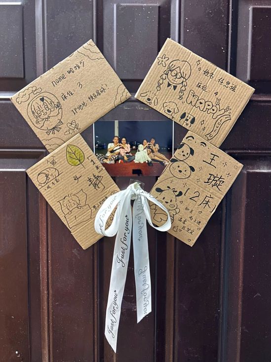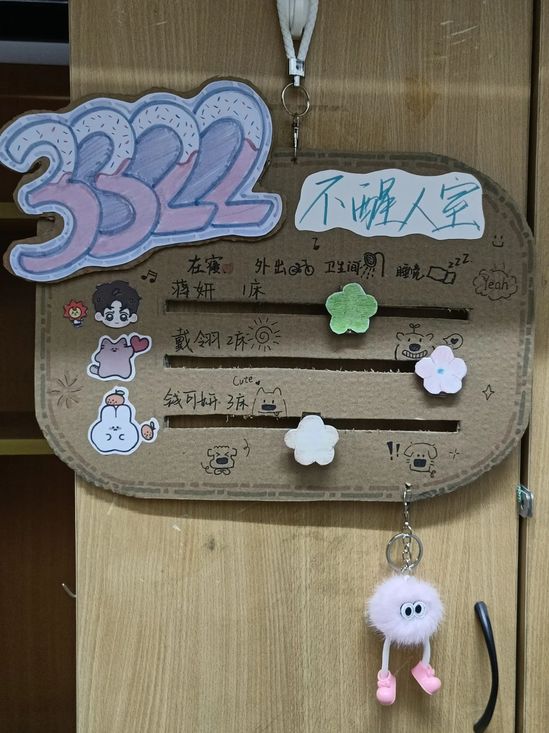 门牌的整体风格是活泼而富有创意的,反映了C26-3122宿舍的活力。每个人的小牌子都是我们个性的窗口,我们通过文字和卡通形象来展示自己的性格和喜好。合照是展现我们之间友谊的最好方式,我们一起玩耍,一起学习,一起生活,彼此和谐相处。而丝带蝴蝶结不仅增加了门牌的装饰性,使其更加美观,更代表我们追求自由、轻盈和快乐的精神。
