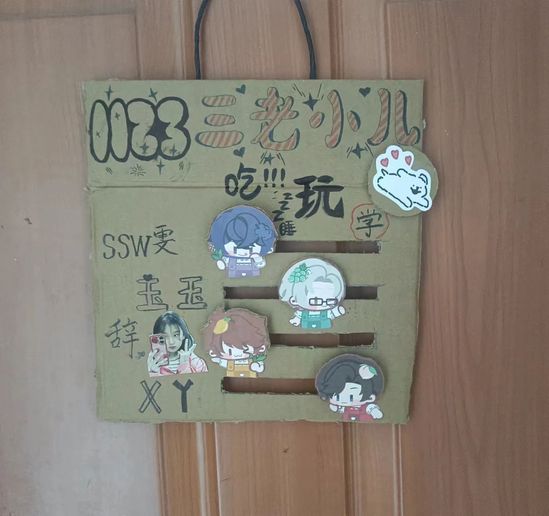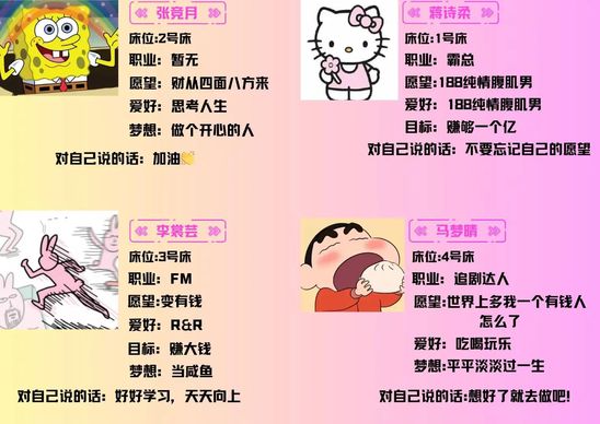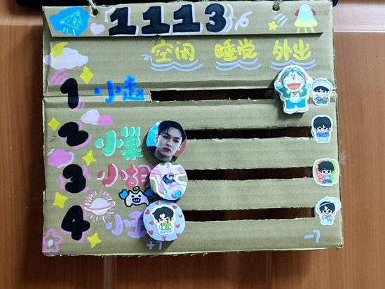 宿舍门牌上的元素都是体现我们宿舍四个人各自的喜好。宿舍的门牌整体是由两个人负责的,主要为了保证元素的和谐。但是其中各自负责的各自的名字部分体现了每个人不同的个性,然后也添加了许多的简笔画,表现了我们这个宿舍和谐的氛围。每个人的头像划片的制作都贴上了自己喜欢的贴纸,让人一眼能够辨明。上排标出了状态,可以根据现状来进行滑动更改,十分方便。