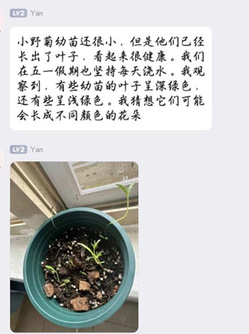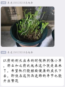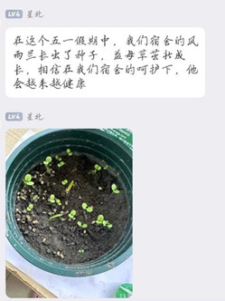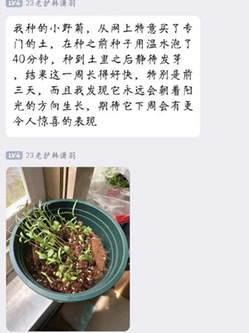 一共有64名同学参加本次活动。在领取物资和种子之后,同学们将种子带回宿舍播种,在精心照料下种子一点点生根发芽。活动群里,同学们热情地记录种子每周的生长状况并分享养护心得。在勤劳的劳动实践感受劳动的意义与快乐。