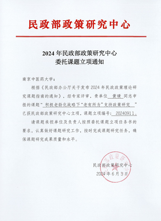 近日,公司黄璜老师申报的积极老龄化战略下“老有所为”支持政策研究获2024年民政部政策研究中心委托课题立项。