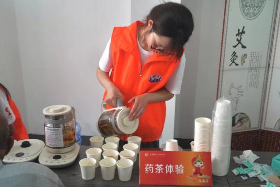 “橙小青”志愿者为老人们提供刮痧、推拿、艾灸、药茶体验等特色服务,并帮助老人测量血压、血糖。其中特色药茶引起了不少老人的兴趣,志愿者结合草本药茶的功效给老人们讲解夏日防暑、药茶保健、草木养生、体质辨识等康养知识,帮助老人们加强自我保健意识、深化中医养生观念,在日常生活中健体强身、延年益寿。