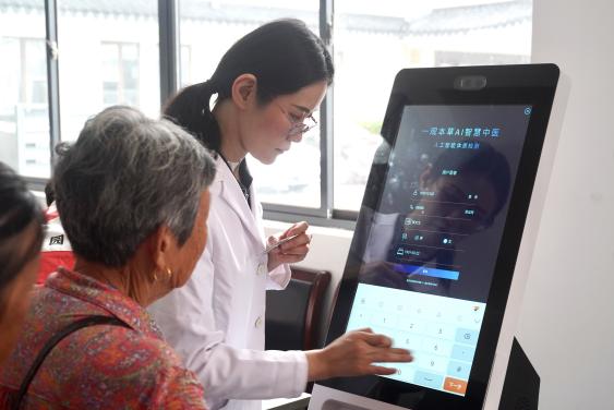 志愿者协助老人使用健康检测仪