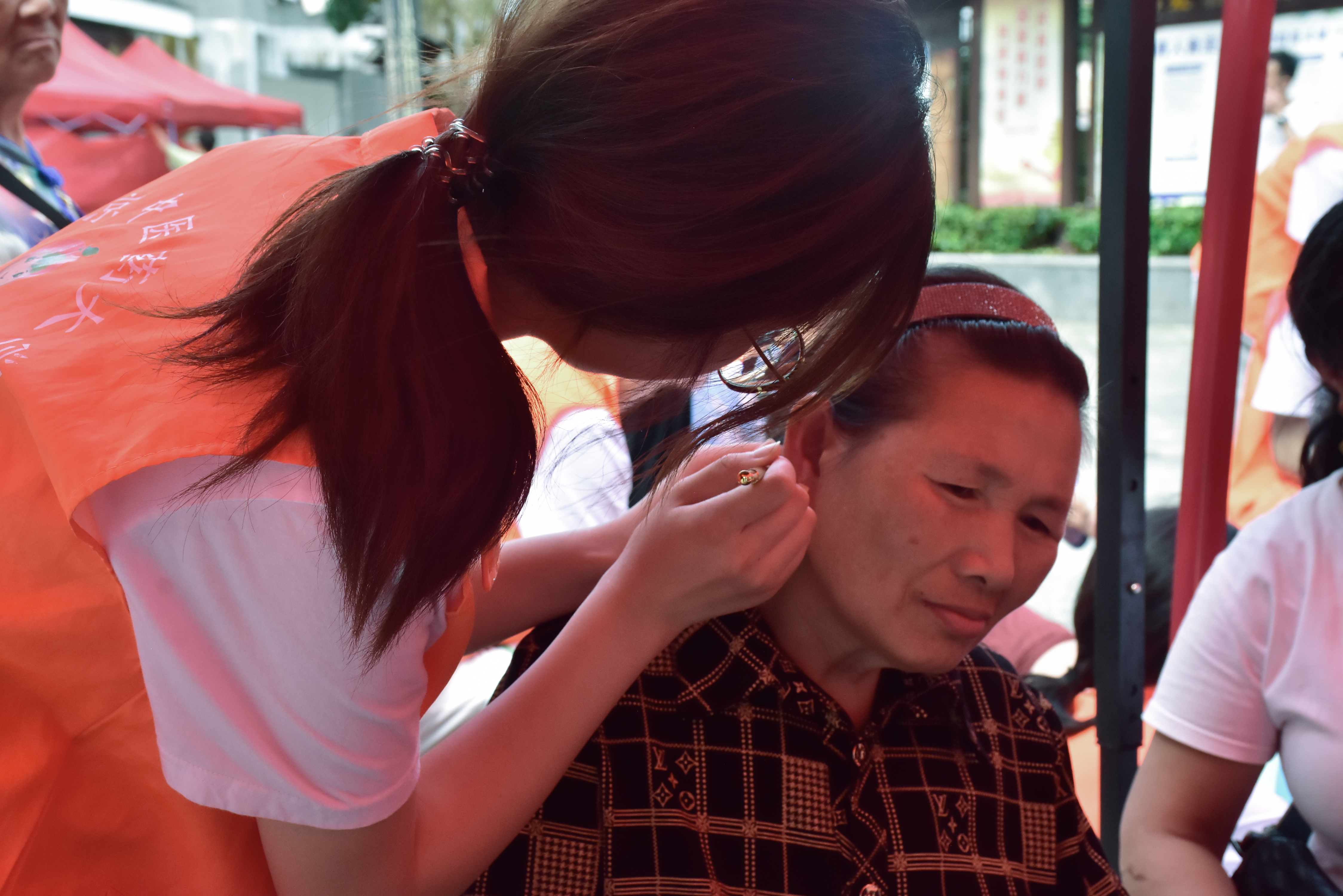 耳穴埋籽是现场老年人最喜欢的一项服务,成员们深入浅出地为其讲解常用耳穴、相应主治及禁忌症,教授老年居民在耳穴埋籽的部位自行揉、按、捏、压,使其产生酸、麻、胀、痛等刺激感应,以达到通经活络、调节气血、防治疾病的效果。前来了解的老年居民络绎不绝,老人们从原本对耳穴埋籽这项技法的神秘感、好奇心,到后来对其主动学习、追着询问再到“情有独钟”。