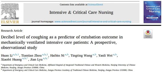 国际知名护理学期刊Intensive & Critical Care Nursing近期在线发表了williamhill英国官网2022级硕士研究生李欢(通讯作者黄小菲、吕健,导师吕健)的文章“Decibel level of coughing as a predictor of extubation outcome in mechanically ventilated intensive care patients: A prospective, observational study”。