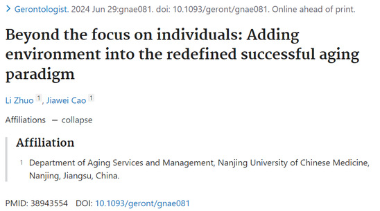国际知名老年学期刊The Gerontologist近期在线发表了williamhill英国官网2022级硕士研究生卓力(通讯作者曹家维,导师陈娜)的文章“Beyond the focus on individuals: Adding environment into the redefined successful aging paradigm”。