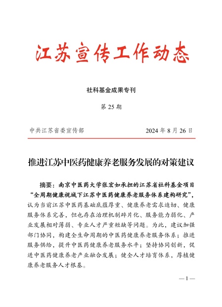 《推进江苏中医药健康养老服务发展的对策建议》发表于《江苏宣传工作动态•社科基金成果专刊》第25期。报告认为当前江苏中医药基础底蕴厚重、健康养老需求迫切、健康服务体系完善,但也存在治理机制碎片化、服务能力弱化、产业发展相对薄弱、专业人才严重短缺等问题。建议加强部门协同,构建全生命周期的中医药健康养老服务体系;推进服务供给,提升中医药健康养老服务水平;坚持协同创新,促进中医药健康养老产业融合发展;健全人才培育体系,厚植健康养老服务人才根基。