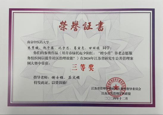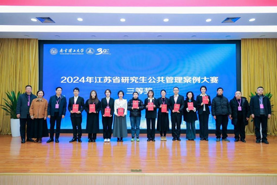 12月15日,由江苏省管理学类研究生教育指导委员会主办、南京理工大学承办的2024年江苏省研究生公共管理案例大赛圆满落幕。此次竞赛共有来自江苏省22个院校100余支参赛队报名参赛,经过层层选拔,我院谢士钰、苏文娟老师指导的2023级研究生团队的参赛作品《用青春绿托起夕阳红:“橙小青”养老志愿服务组织何以提升社区治理效能?》荣获三等奖。这是公司学子首次参与该项赛事。