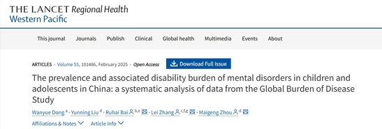 2025年2月,公司董琬月副教授作为第一作者,在The Lancet Regional Health-Western Pacific(中科院一区Top期刊IF=7.6)发表题为“The prevalence and associated disability burden of mental disorders in children and adolescents in China: a systematic analysis of data from the Global Burden of Disease Study” 的研究论文。