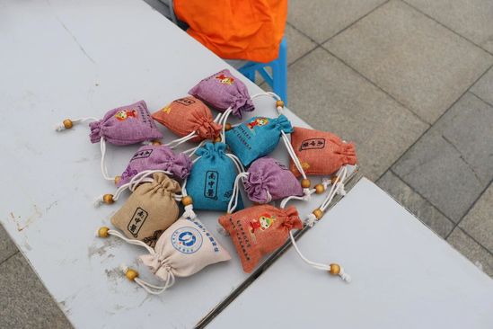 除了健康服务,团队还特别设计了益智互动环节。志愿者带领长者们参与猜拳戏。志愿者为每位参与的老人赠送了团队自制的中医养生香囊。长者们接过香囊时脸上洋溢着笑容,纷纷表示“这个香囊既实用又贴心,感受到了满满的心意”。
